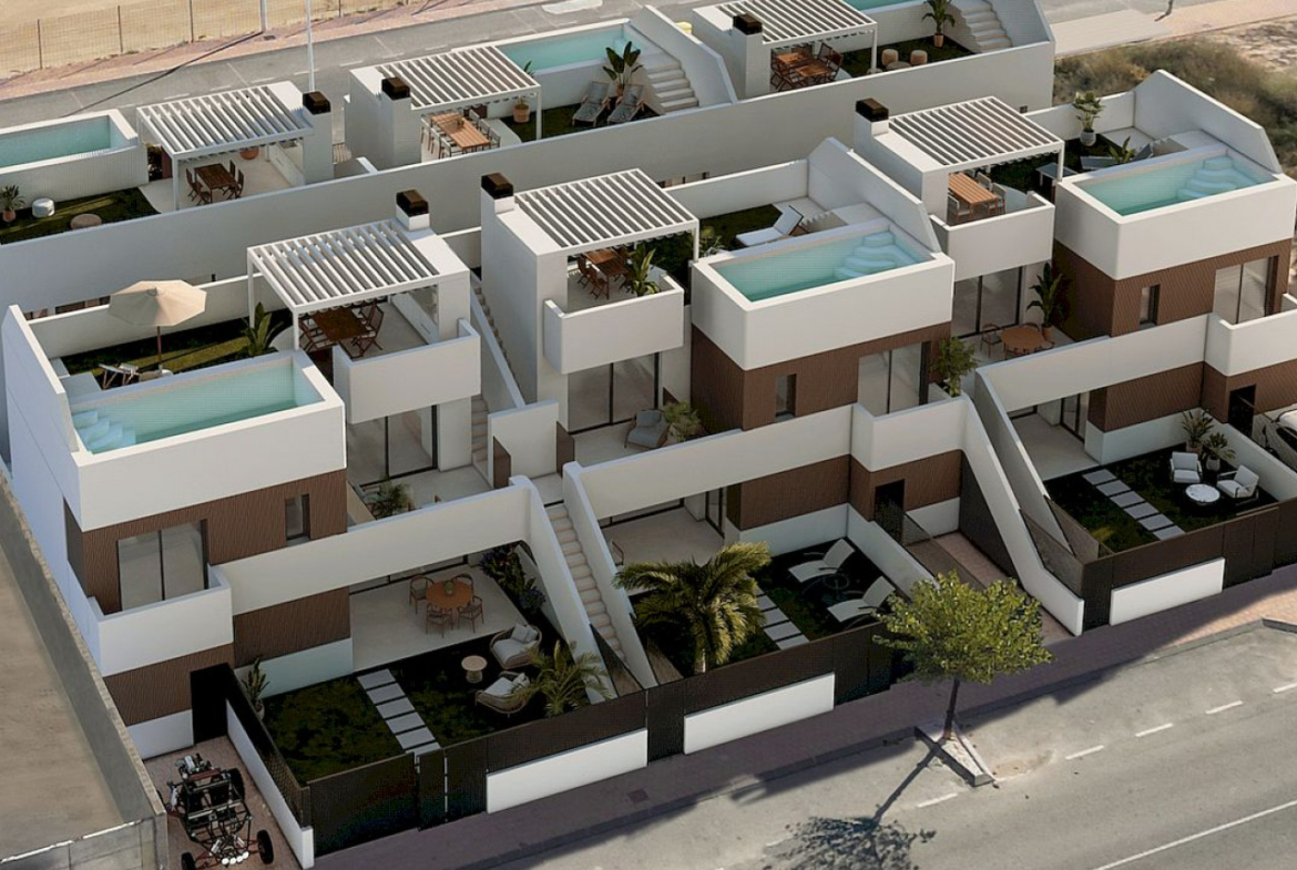 Alma Maisonettes to ekskluzywny projekt dwupokojowych dwupoziomowych apartamentów, każdy z nich zaprojektowany z designerską precyzją i wyposażony w prywatny basen, położony w San Pedro del Pinatar.