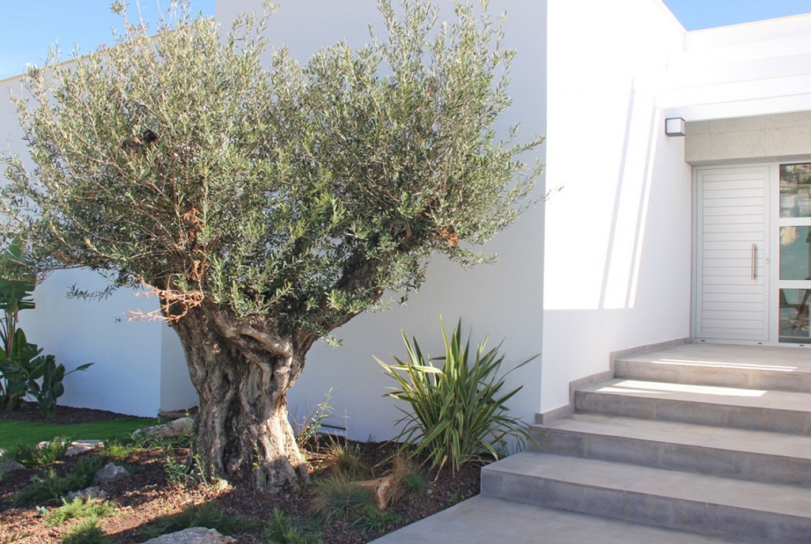 Projekt Villi Altair łączy w stylowy i funkcjonalny sposób prawdziwie nowoczesną architekturę. Na elewacji, charakteryzującej się dużymi figurami geometrycznymi, stworzonymi w oparciu o proste linie i kształt sześcianów, dominuje kolor biały, nadający willi elegancki, a zarazem minimalistyczny wygląd. Część dzienna znajduje się na tym samym piętrze. Przestronna kuchnia z wyspą pośrodku i wyposażona w sprzęt AGD najwyższej marki, duży salon oraz taras z niesamowitym widokiem na Morze Śródziemne. Salon ma bardzo ciepły i przytulny wystrój. Składa się z dużego pokoju, który można podzielić na dwa pokoje dla większej prywatności. Na tym samym piętrze znajduje się główny apartament z własną łazienką i prywatnym tarasem, na którym można cieszyć się piękną pogodą i widokiem na morze w zaciszu własnego pokoju. Na dolnym piętrze znajdują się dwie duże sypialnie, każda z własną łazienką i tarasem, na którym można spędzać czas na świeżym powietrzu. Na tym piętrze znajduje się również mały salon, w którym można czytać, medytować lub po prostu odpocząć. Powierzchnię tarasu wieńczy basen typu infinity, gdzie można w pełni korzystać ze słońca i spektakularnych widoków. Idealne miejsce na aperitif, grilla z przyjaciółmi i rodziną lub po prostu sjestę na słońcu.