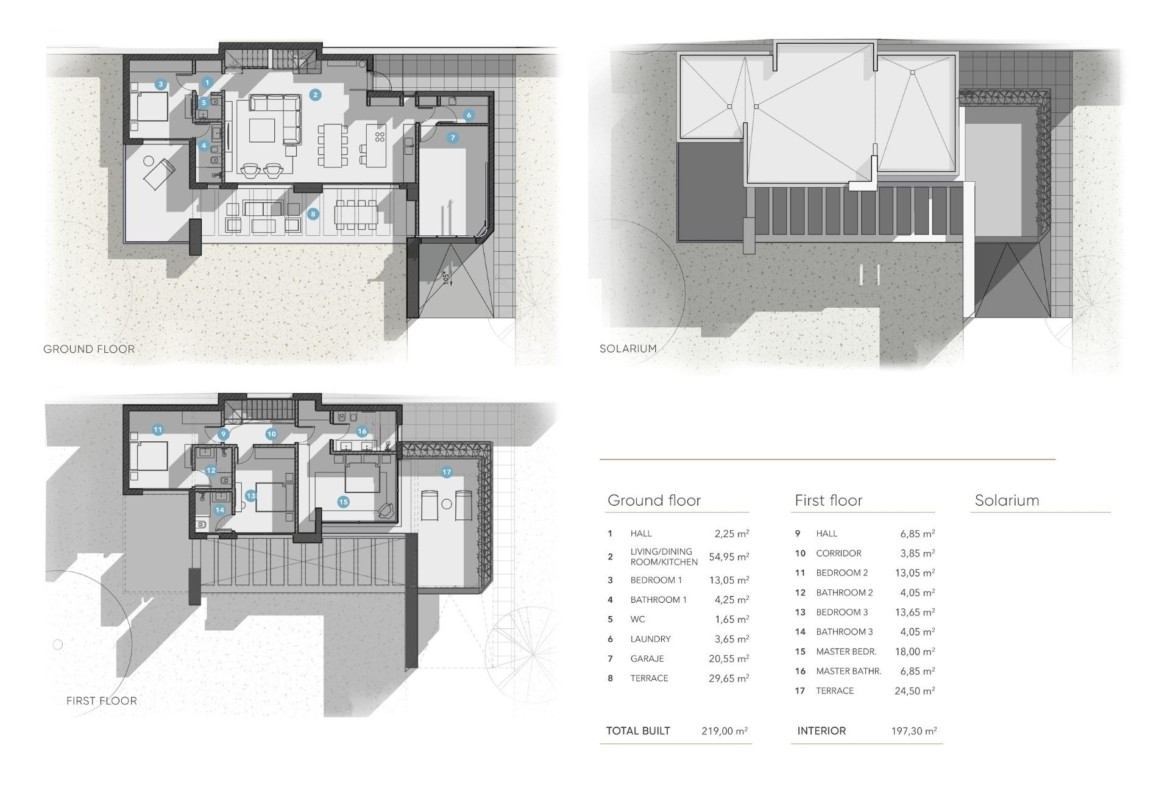 Luksusowe wille mają dobrze rozplanowaną przestrzeń wewnętrzną, w której salon, jadalnia i w pełni wyposażona kuchnia z częścią śniadaniową łączą się w przestrzeń życiową, która maksymalizuje widoki z ponadwymiarowych potrójnych drzwi i okien. Połączenie między przestrzenią zewnętrzną i wewnętrzną jest płynne dzięki dużym zadaszonym i odkrytym tarasom – idealne miejsce na relaks i podziwianie widoków na Morze Śródziemne.
