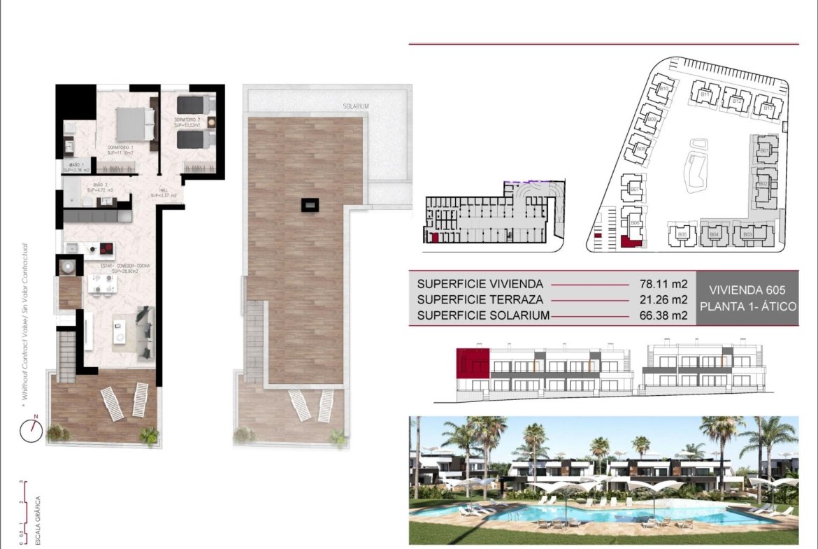 Bungalowy: Jednostki na parterze z prywatnymi ogrodami lub opcje na najwyższym piętrze z solarium. Wszystkie bungalowy obejmują dwie sypialnie, dwie łazienki, miejsce parkingowe i pomieszczenie gospodarcze, położone wokół centralnego obszaru wspólnego z basenem i ogrodami krajobrazowymi.