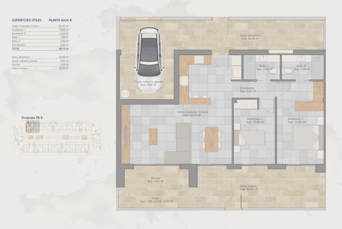 Odkryj nowy kompleks mieszkaniowy w Torre-Pacheco, oferujący 24 stylowe bungalowy z 2 lub 3 sypialniami. Do wyboru są domy na parterze z przestronnymi tarasami lub jednostki na pierwszym piętrze z prywatnymi tarasami i solariami. Każde solarium obejmuje pergolę, miejsce do grillowania i wzmocnione zadaszenie, idealne do zainstalowania jacuzzi. Wszystkie domy posiadają wyznaczone miejsce parkingowe i w pełni zainstalowaną klimatyzację, zapewniającą komfort przez cały rok.