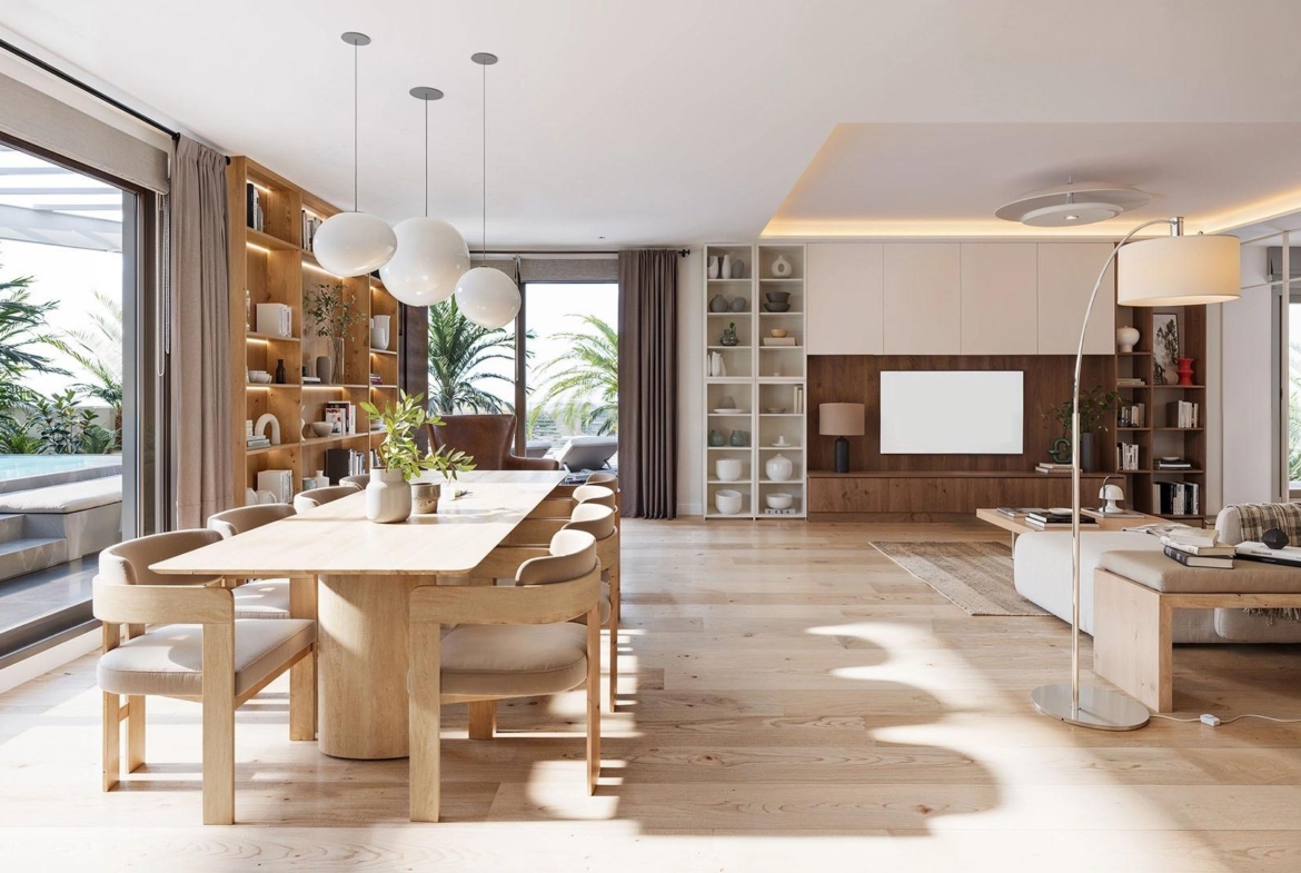 Wielkoformatowe podłogi porcelanowe z drewnianym wykończeniem, zapewniające ciągłość i ciepło.