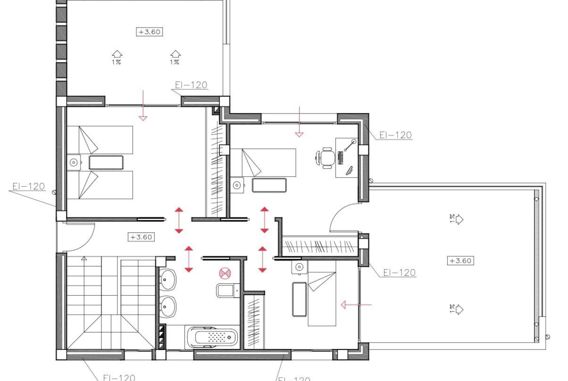 Na piętrze znajdują się trzy dodatkowe sypialnie, w pełni wyposażona łazienka oraz dwa prywatne tarasy z panoramicznym widokiem na gaje pomarańczowe, tworzące spokojną przestrzeń do relaksu i cieszenia się otoczeniem.
