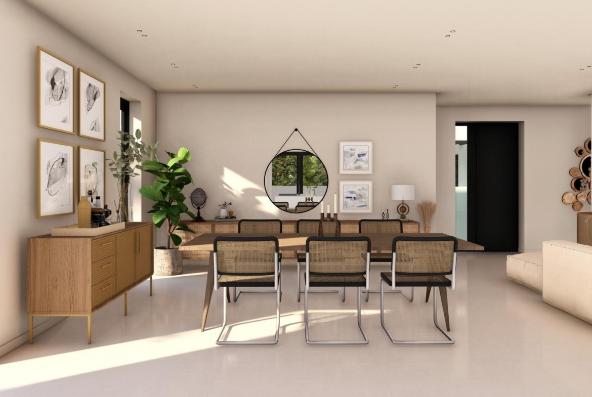 Na parterze znajduje się jedna lub dwie dodatkowe sypialnie z łazienkami, toaleta dla gości oraz otwarta kuchnia połączona z salonem i jadalnią, z bezpośrednim dostępem do tarasu i basenu. Każda nieruchomość posiada solarium na dachu, z którego roztacza się panoramiczny widok na góry lub morze i gdzie można zainstalować jacuzzi.