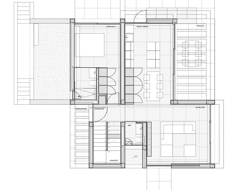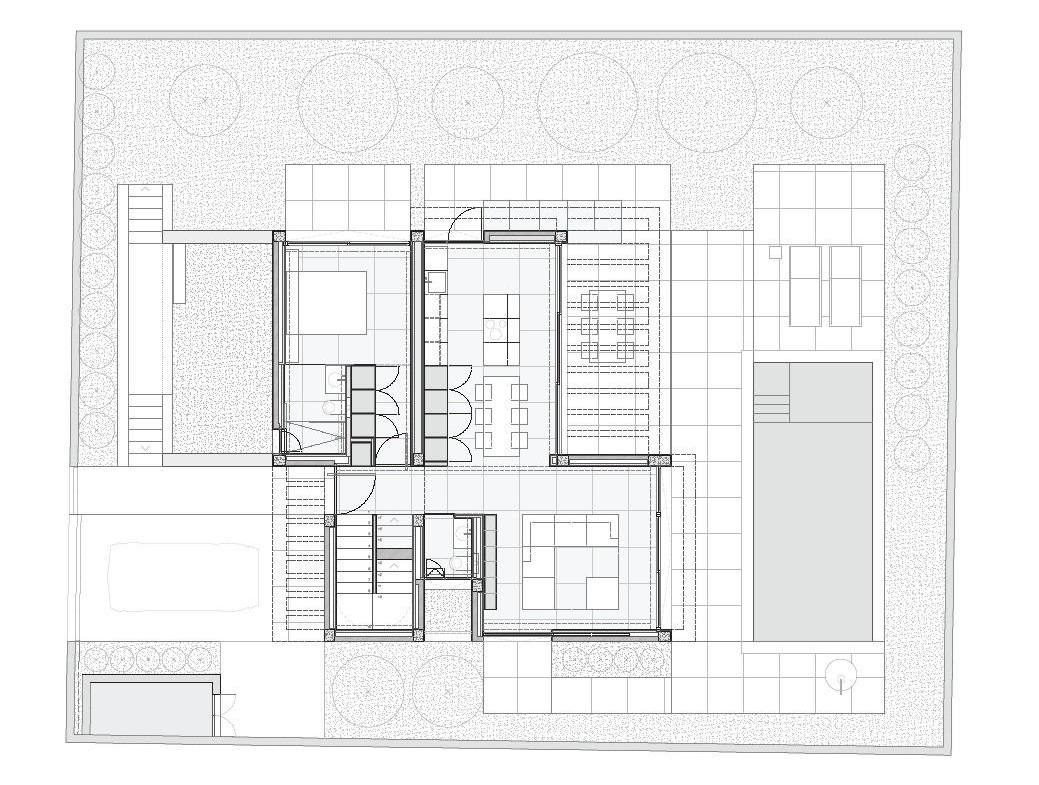 Na parterze znajduje się hol wejściowy z wbudowaną szafą i toaletą dla gości. Na tym poziomie znajduje się jedna sypialnia z łazienką i podnoszonymi drzwiami okiennymi od podłogi do sufitu, które otwierają się na prywatny taras boczny. Jasny, otwarty salon i jadalnia łączą się bezpośrednio z tarasem pokrytym pergolą i prywatnym basenem ze słoną wodą, tworząc harmonijny styl życia wewnątrz i na zewnątrz.