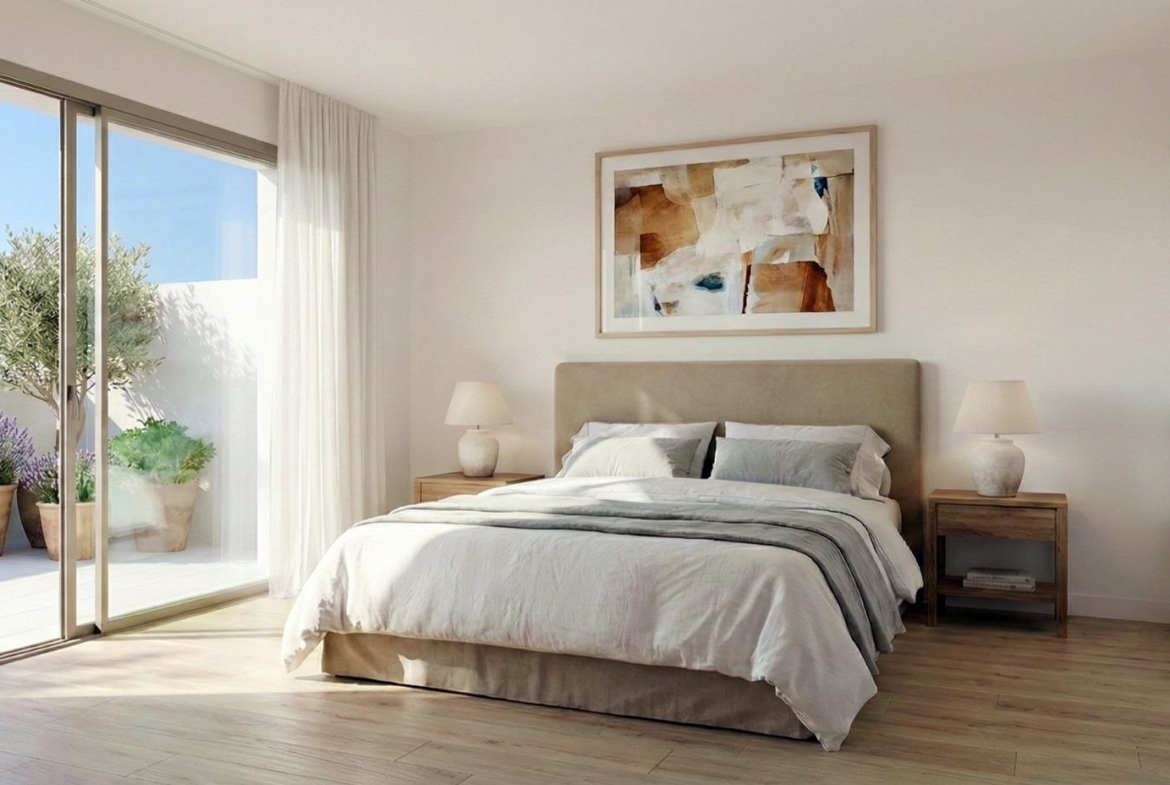 Bungalowy na najwyższym piętrze posiadają przestronny taras i prywatne solarium na dachu. Solarium wyposażone jest w letnią kuchnię i oferuje możliwość dodania prywatnego basenu lub jacuzzi za dodatkową opłatą, co czyni je idealnym miejscem do relaksu, ciesząc się ciepłym śródziemnomorskim klimatem i otwartymi widokami.