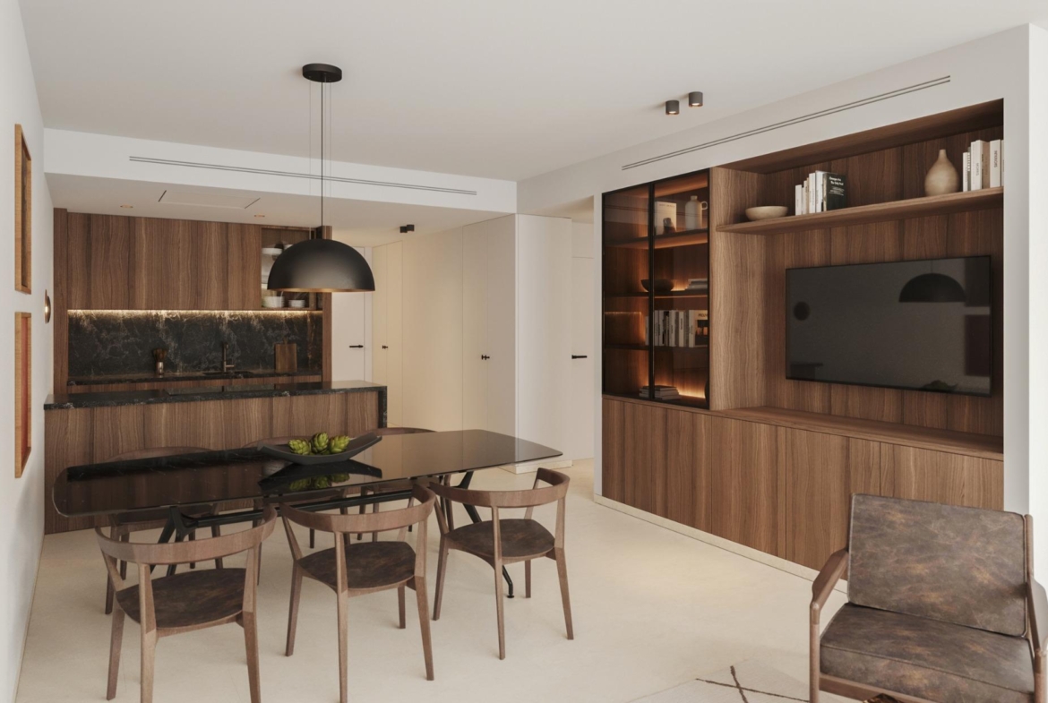 Wnętrza apartamentów Standard i Premium zostały starannie zaprojektowane przez naszych architektów. Wszystkie apartamenty są w pełni umeblowane, z podgrzewanymi podłogami we wszystkich pomieszczeniach, przełącznikami światła Schneider, inteligentnymi zamkami i podstawową automatyką klimatyczną, a także wodooszczędnymi łazienkami i kuchniami oraz połączeniami ze stacją pogodową. Szwedzki sprzęt AGD Asko Kitchen: kuchenki, piekarniki i okapy, zmywarki, lodówki. Pralnia: pralka i suszarka. Niemiecka armatura łazienkowa firmy Villeroy & Boch, drzwi przesuwne łączą tarasy i pokoje dzienne w jedną przestrzeń, harmonizując życie wewnątrz i na zewnątrz, a każda jednostka została zaprojektowana z ruchomymi ścianami, aby dostosować się do ewolucji rodzin. Drewniane składane ekrany zapewniają cień, umożliwiając jednocześnie cyrkulację powietrza. Standard: jasne meble. Premium: drewniane meble z ciemnym lakierem, kamienne powierzchnie.